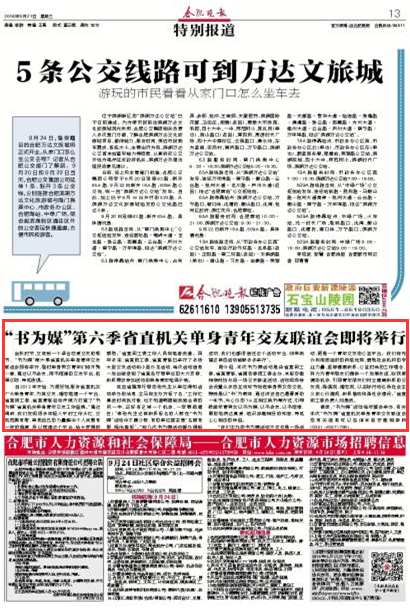 据介绍,本次书为媒活动是由省直团工委、省直青联、省国资委团工委主办,本报安徽相亲网协办的一场交友联谊活动,活动现场将会设置众多的互动环节促进单身男女的交流,特别是以“书”为载体,通过讲述自己最喜爱的一本书、与心仪的TA互相交换书等方式,引导鼓励年青男女以书为媒,以书会友,以书结缘,勇敢地表达真爱,结识志趣相投的知音,寻觅心心相印的伴侣。
