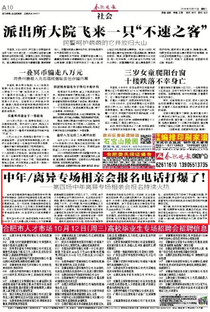 由本报安徽相亲网推出的第四场中年/离异专场相亲会,自昨日开始接受报名起,就引起了我市乃至省内其他城市的离异大龄单身人士的高度关注。仅一天时间,安徽相亲网的报名电话就被众多报名人士及其父母亲戚狂轰滥炸。许多父母纷纷打进热线询问各种问题。在所有电话咨询中,60后的家长们询问得最仔细。