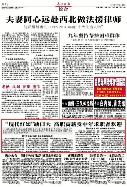 现代社会的高速发展,交际面的变窄造成单身人群的激增,而对于“婚恋顾问”这个角色的需求量也日益增大,安徽相亲网的红娘老师就告诉记者,目前专职从事这个职位的人并不多,因为很多人并不以为甚至不知道还有这样一个岗位,并且缺口还这么大,然而每天面对的单身人群却是非常之多,社会的确非常需要“婚恋顾问”这个岗位群体。