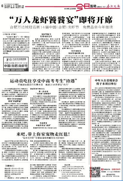 因发展需要,本报安徽相亲网特向社会招募婚恋顾问5名,同时本报安徽相亲网在每月有各类中高端相亲会举行,有关提供活动场地及其他服务的商家可以联系0551-65571768。