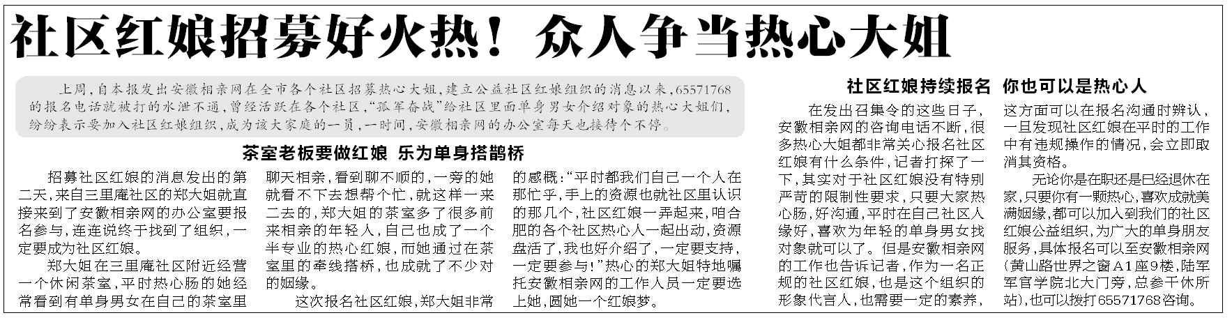 上周,自本报发出安徽相亲网在全市各个社区招募热心大姐,建立公益社区红娘组织的消息以来,65571768的报名电话就被打的水泄