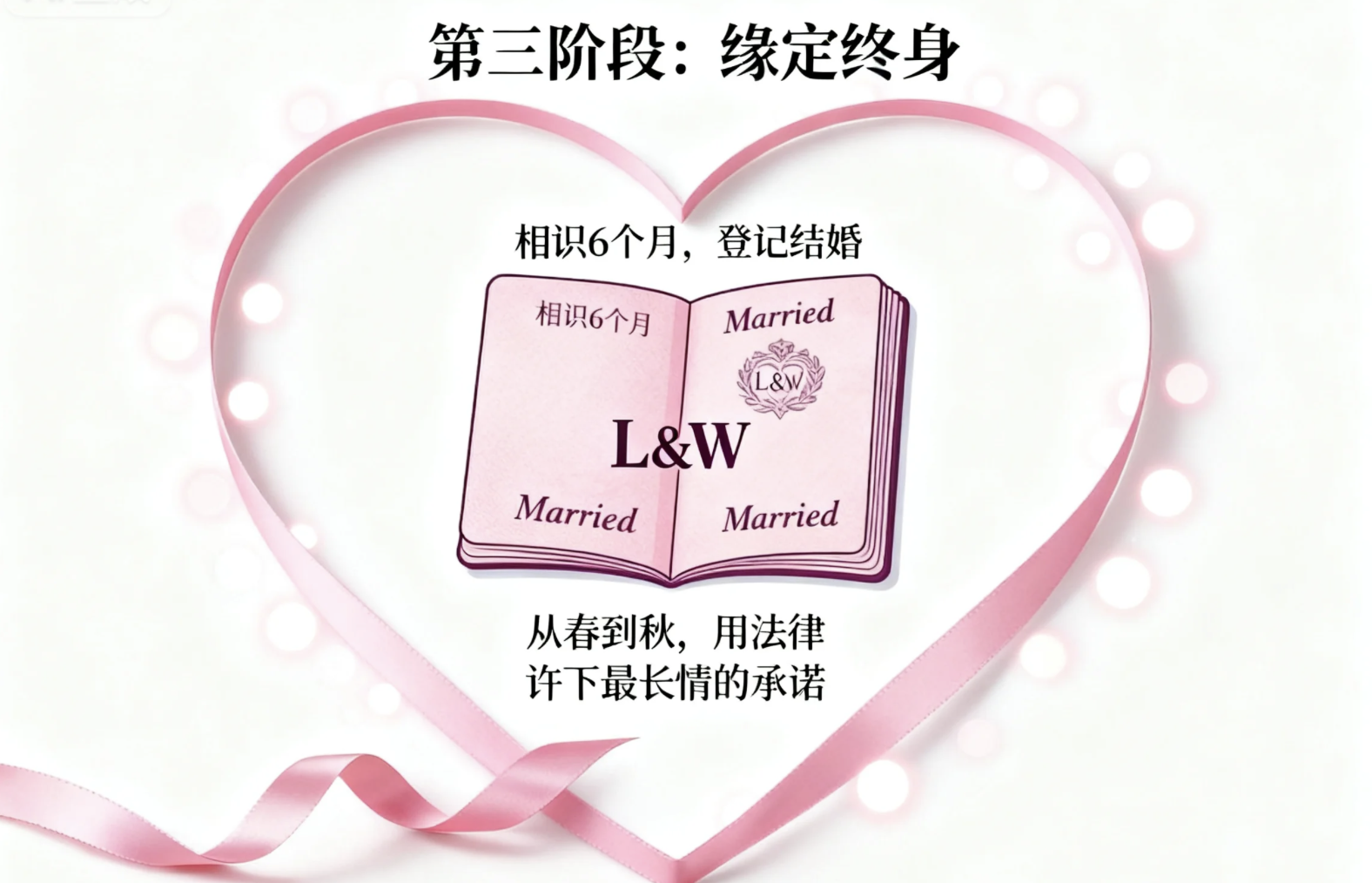见过家长后,两人的关系更加稳固,开始具体地规划共同的未来。他们对于婚姻的期待高度一致,一切都水到渠成。从春光明媚的初遇,到秋高气爽的承诺,在相识整整6个月的那一天,他们做出了最重要决定——前往民政局登记结婚,为他们的爱情盖上了法律的印章。